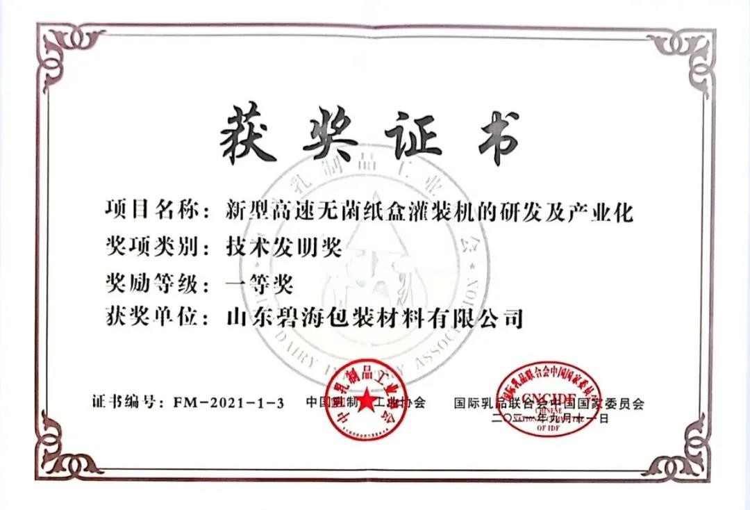 11日,在2021年度中國(guó)乳業(yè)科技系列頒獎(jiǎng)盛典上,碧海包裝又一新型高速無菌紙盒灌裝機(jī)獲技術(shù)發(fā)明獎(jiǎng)一等獎(jiǎng),公司執(zhí)行總經(jīng)理王立上臺(tái)接受頒獎(jiǎng)。