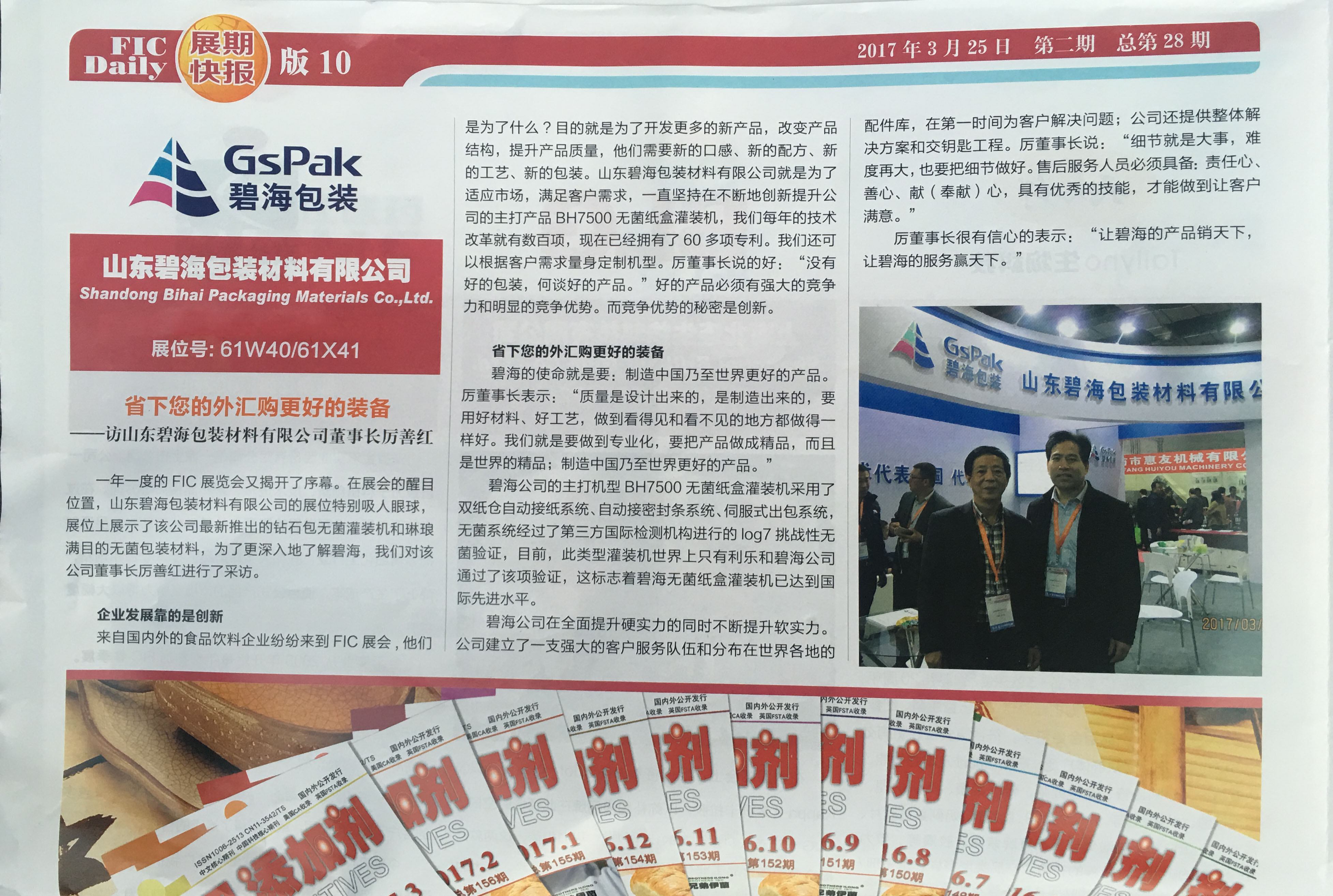 一年一度的FIC展覽會又揭開了序幕。在展會的醒目位置,山東碧海包裝材料有限公司的展位特別吸人眼球,展位上展示了該公司最新推出的鉆石包無菌灌裝機和琳瑯滿目的無菌包裝材料,為了更深入地了解碧海,我們對該公司董事長厲善紅進行了采訪。